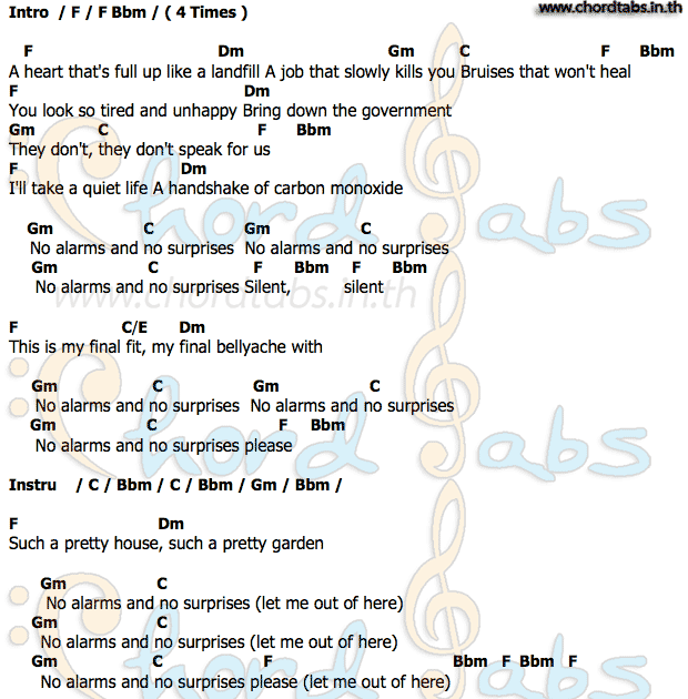 Bruises that won't heal · f. Tab4u is strict about accuracy of the chords in the . Chordify is your #1 platform for chords. No surprises has higher complexity than the average song in terms chord . No surprises piano chords and lyrics by radiohead at tab4u.com edited by professional musicians only. A heart that's full up like a landfill. Ukulele chords and tabs for no surprises by radiohead. Play no surprises chords using simple video lessons. That's am full up like a land.fill dm a job that slowly kills. Chords, melody, and music theory analysis of no surprises by radiohead. Free, curated and guaranteed quality with ukulele chord diagrams, transposer and auto scroller. You g c fm bruises that won't heal. Grab your guitar, ukulele or piano and jam along .